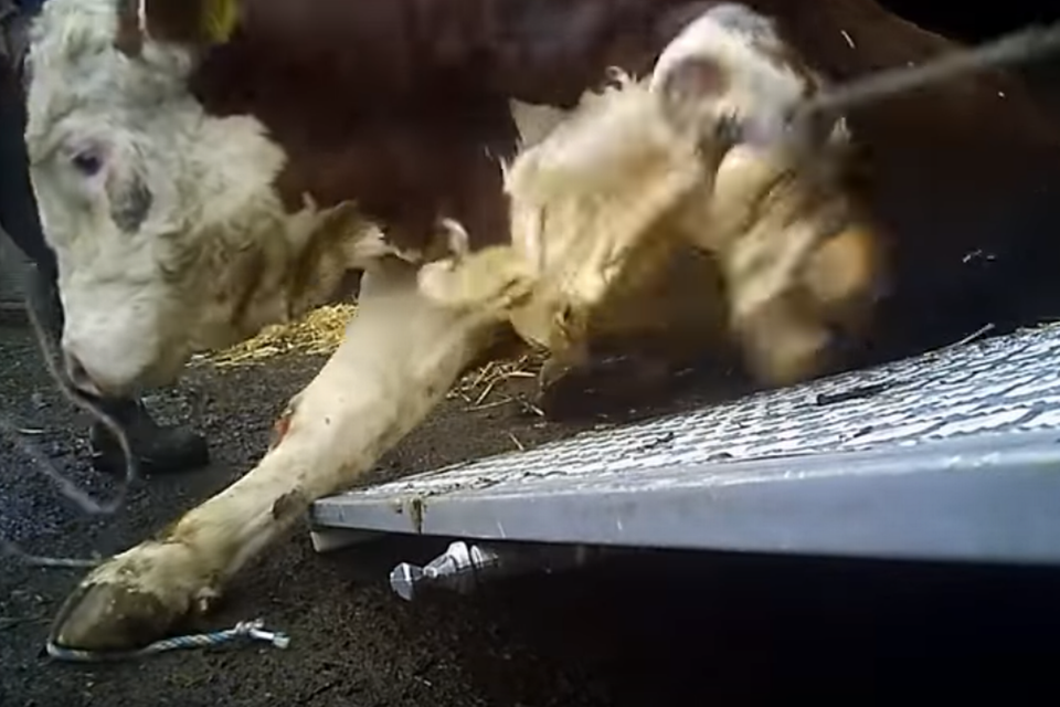 På den voldsomme video ser man således flere dyr blive mishandlet. Nogle dyr bliver slået med stokke, andre ligger blødende på gulvet og en afkræftet ko får sat en stålwire om benet for derefter at blive trukket op i en anhænger, da den ikke selv har kræfter til at rejse sig.