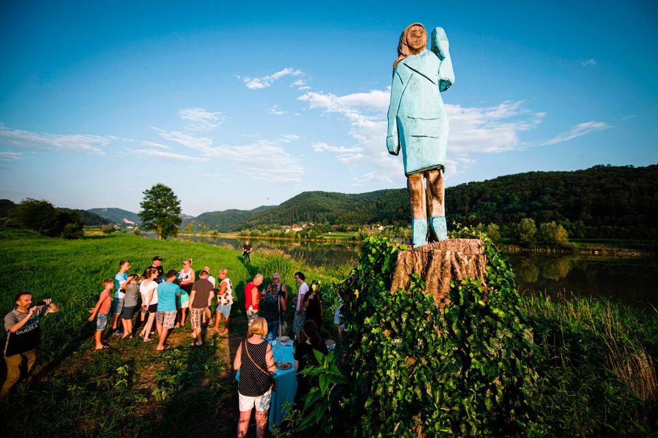 En træskulptur i fuld størrelse af Melania Trump er blevet rejst på en mark uden for præsidentfruens fødeby Sevnica i Slovenien. Men kunstværket har fået en blandet modtagelse, siden det blev afsløret fredag.