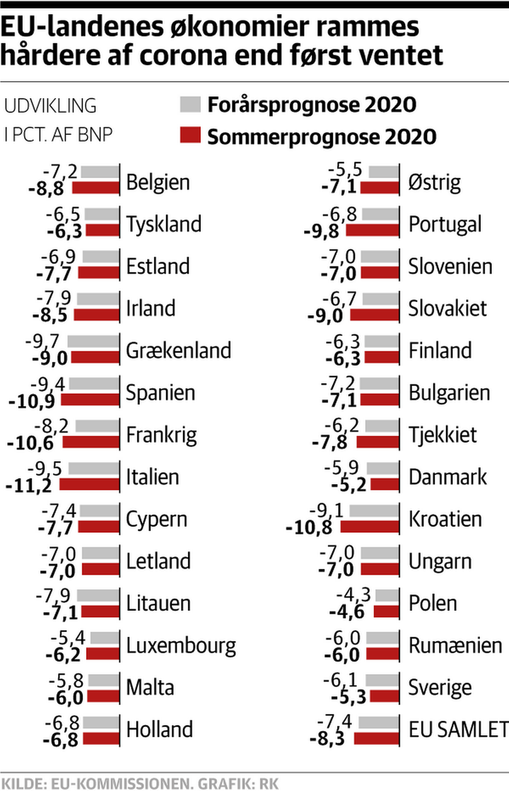 Coronakrisen rammer endnu hårdere, end EU-Kommissionen forudså i maj. Men Danmark klarer sig bedre end ventet.