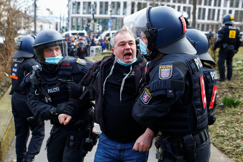 Det endte med sammenstød med politiet, da op mod 10.000 mennesker lørdag mødte op i den centrale del af byen Kassel i det centrale Tyskland for at protestere mod restriktionerne under coronapandemien.
