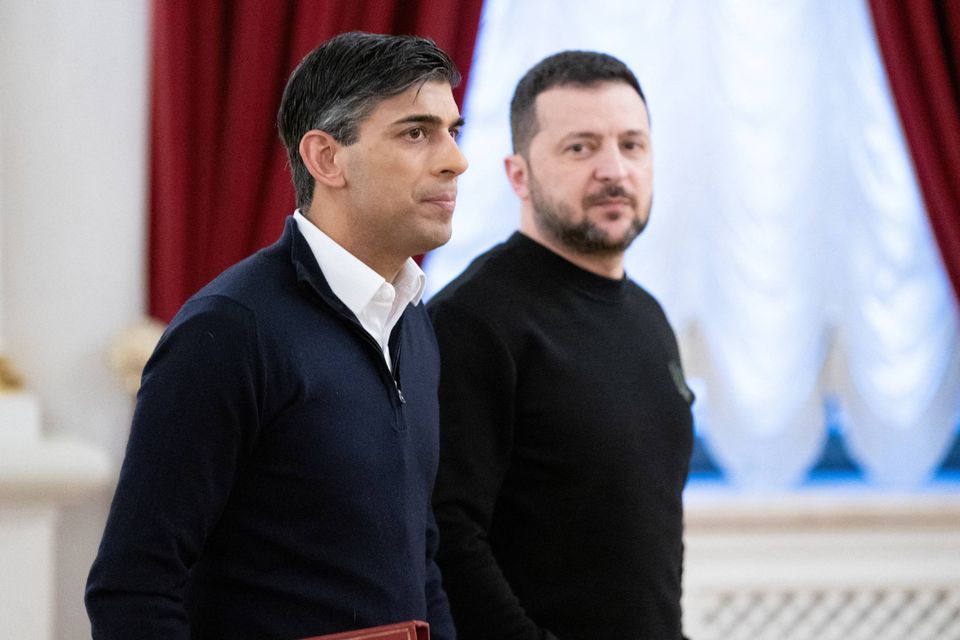 »Jeg er her i dag med et budskab: Storbritannien vil heller ikke vakle. Vi vil stå sammen med Ukraine, i deres mørkeste timer og i de bedre tider, der kommer,« siger Rishi Sunak ifølge en pressemeddelelse.