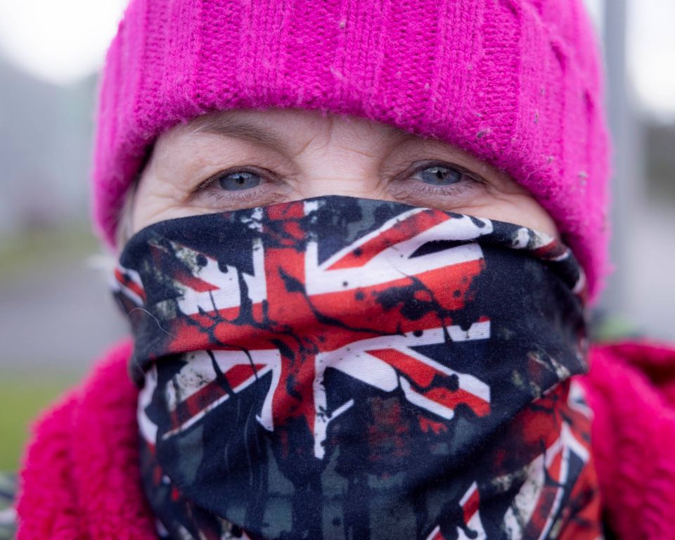 Melody Smith kommer traskende ned ad Oldham Road med et sammenfoldet Union Jack-flag under armen.