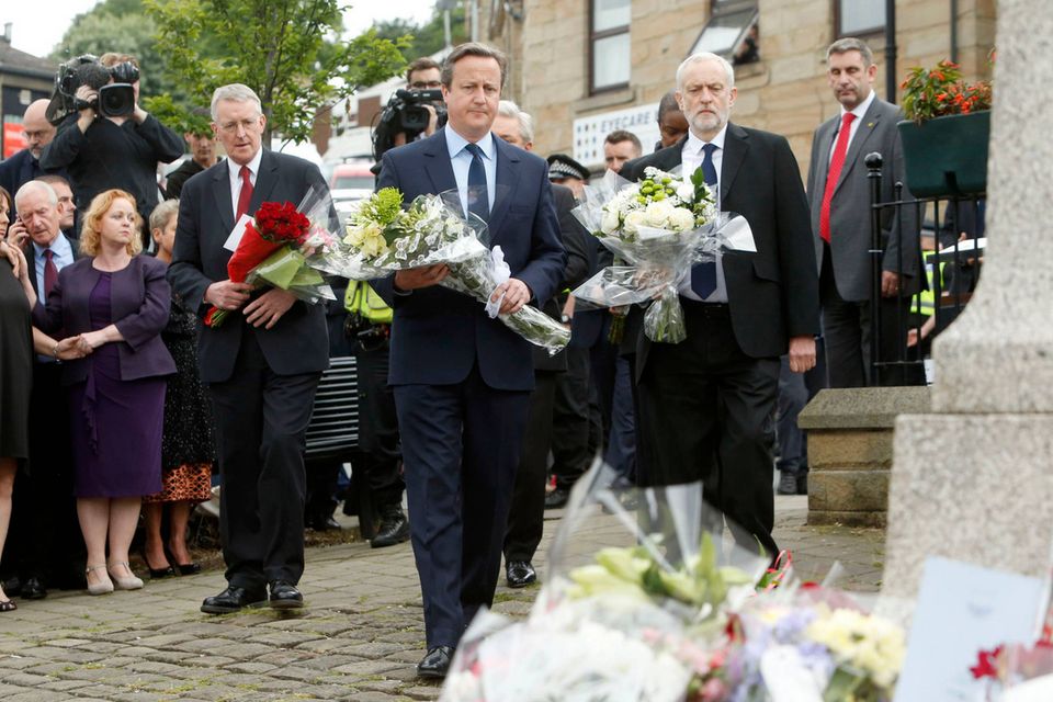 Den britiske premierminister, David Cameron, tog fredag eftermiddag ud til det sted, hvor parlamentarikeren Jo Cox blev dræbt, for at mindes hende sammen med Labours leder, Jeremy Corbyn.