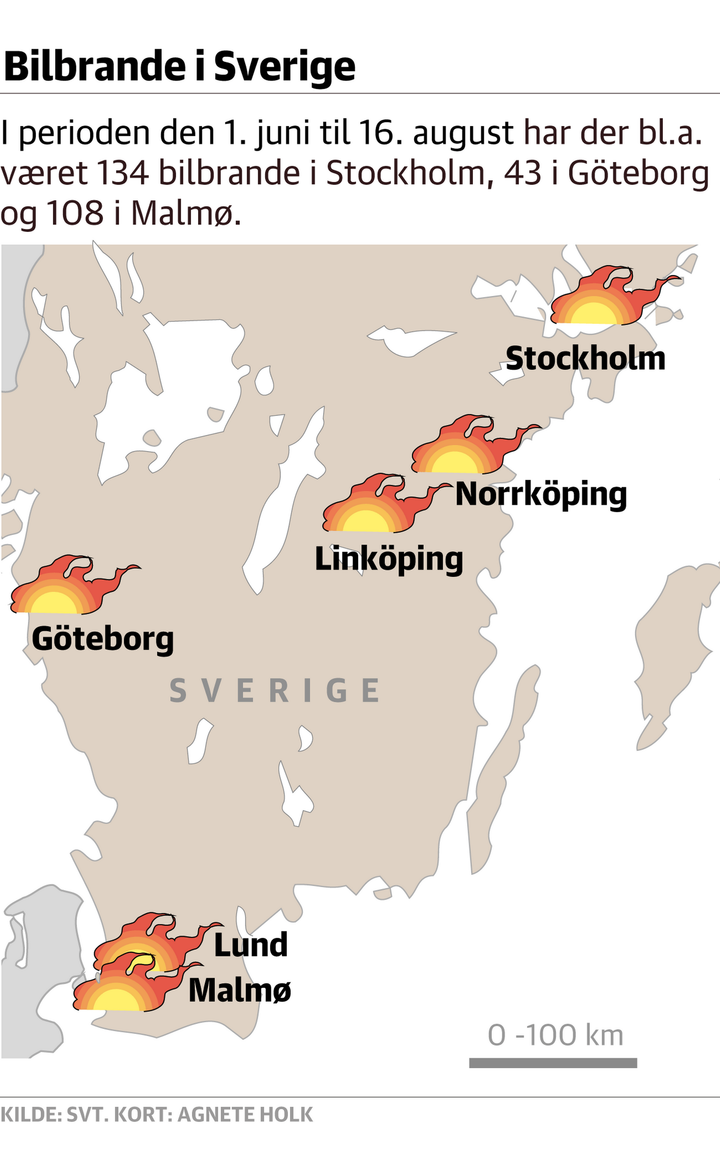 Siden den 1. juni har der ifølge SVT's optælling været 134 bilbrande i Stockholm, 43 i Göteborg og 108 i Malmø.