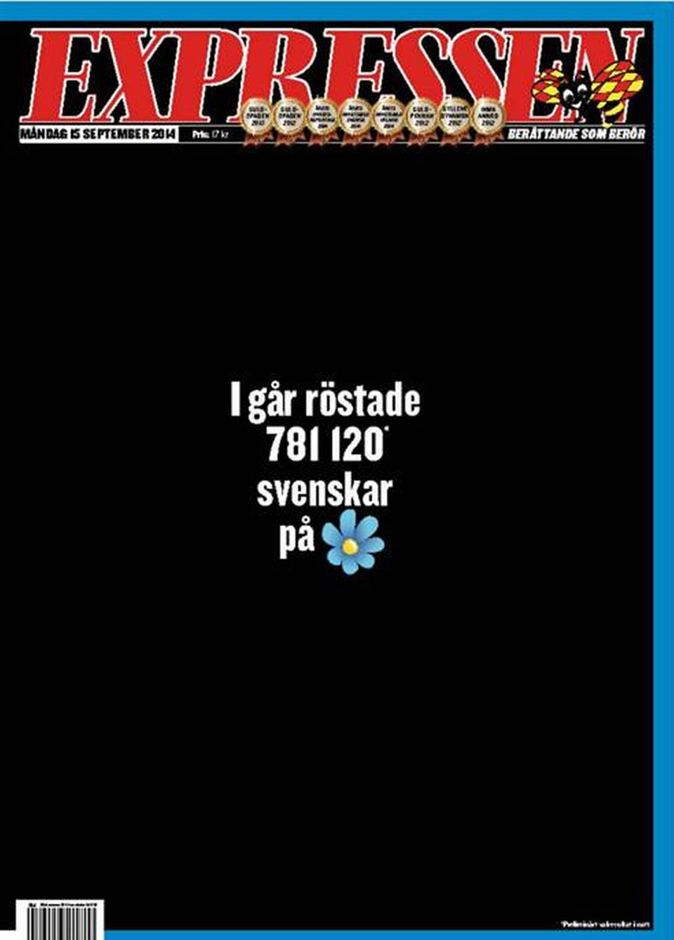 Således udkom Expressen med en næsten kulsort forside, hvorpå disse ord stod: "I går stemte 781.120 svenskere på..." - hvorefter Sverigedemokraternes logo, en blå blomst, havde erstattet partinavnet.