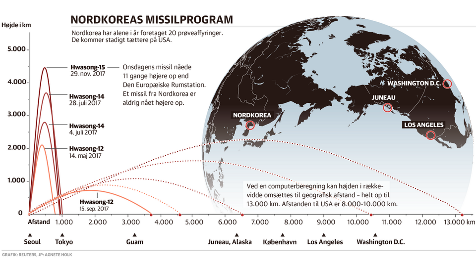 Men nu lød ekspertvurderinger, at Hwasong-15-missilet har en mulig rækkevidde på over 13.000 km, hvis det affyres i den rette vinkel. Dermed kan Nordkorea potentielt ramme både Los Angeles, Washington − og for den sags skyld også København.