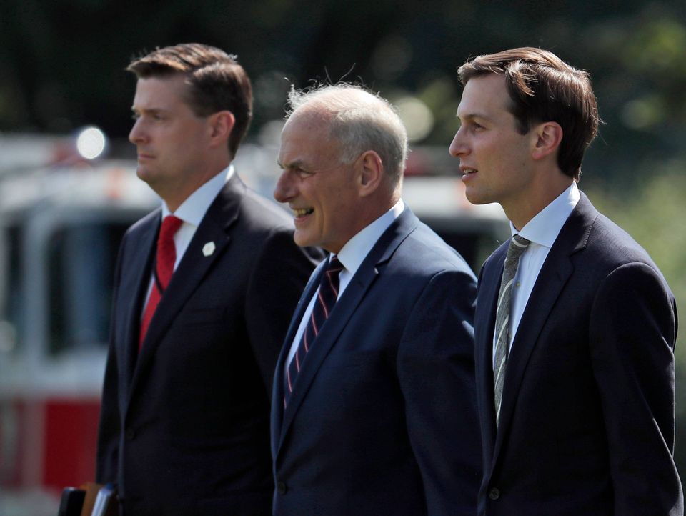 Rob Porter (tv.) var ikke kendt i den brede offentlighed, men var en nøgleperson i Det Hvide Hus og arbejdede tæt sammen med stabschef John Kelly (midt). Trumps svigersøn, Jared Kushner (th.), er en af de personer i Det Hvide Hus, som stadig ikke har fået permanent sikkerhedsclearing, men alligevel har adgang til klassificerede oplysninger. Foto: AP/Alex Brandon