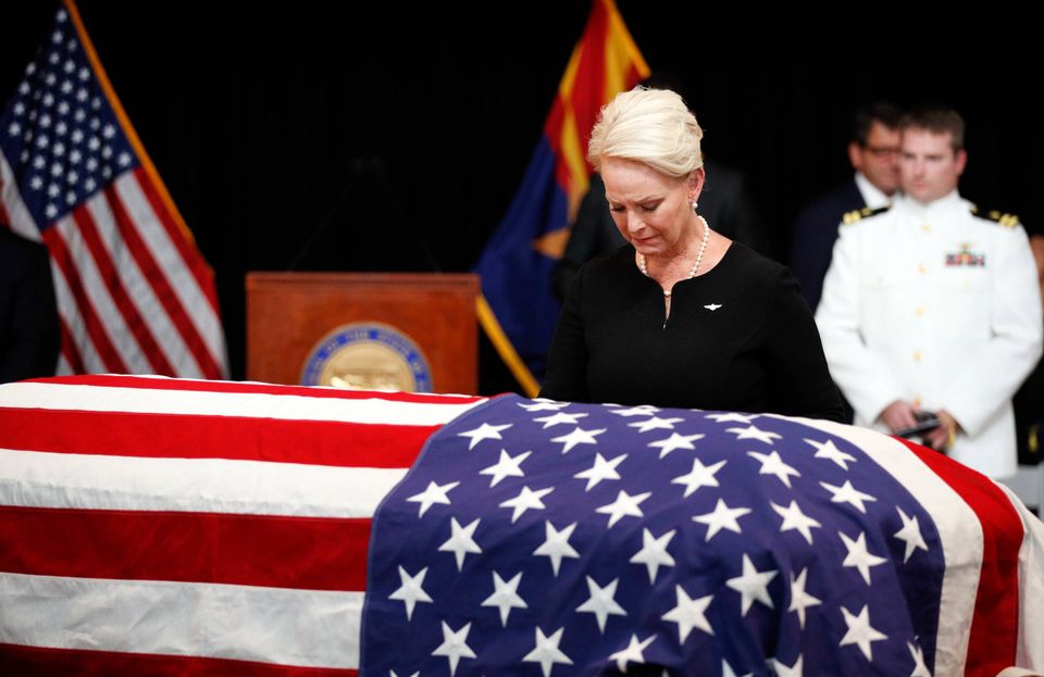 John McCains hustru, Cindy McCain, gør holdt ved kisten under en mindehøjtidlighed i delstaten Arizona ondsag. Foto: Jae C. Hong/AP Photo