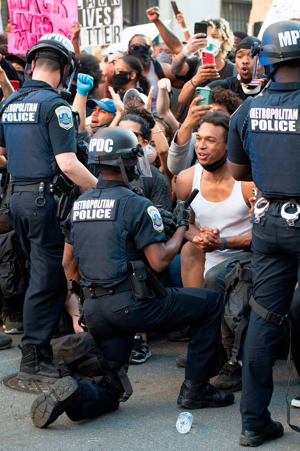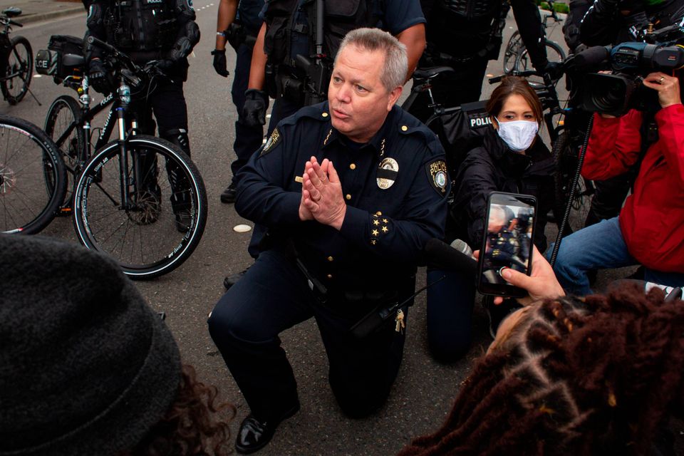 Andre steder i landet knælede betjente - et udbredt signal om solidaritet og modstand mod politivold - før og under demonstrationerne.