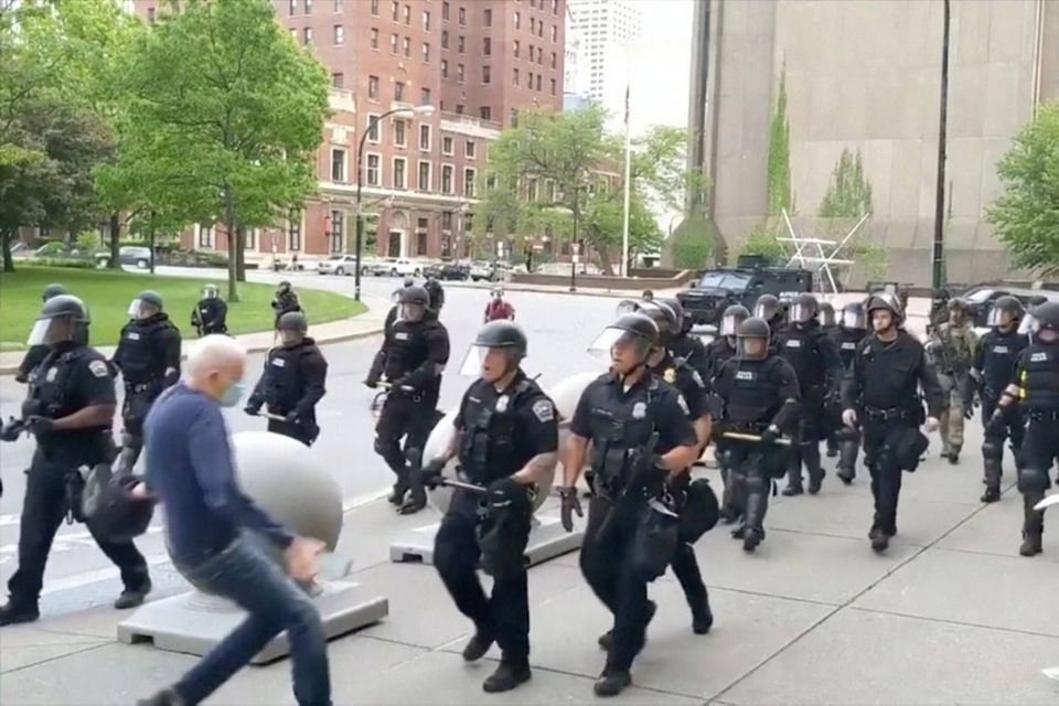 En 75-årig mand blev torsdag væltet omkuld af to politibetjente under en demonstration i byen Buffalo i staten New York i USA.