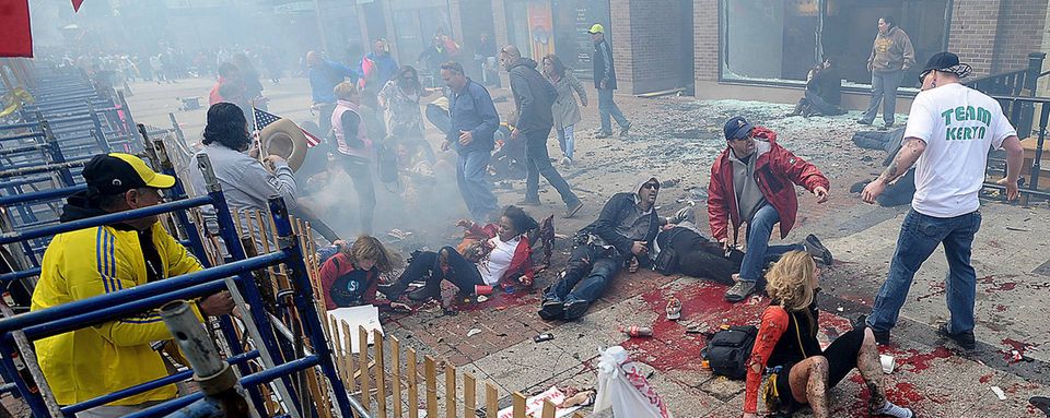 Den første eksplosion fandt sted ganske tæt på mållinjen, og den næste på samme gade men en blok længere væk. Eksplosionerne fik målområdet til at ligne en krigszone med folk, der skrigende flygtede fra stedet.