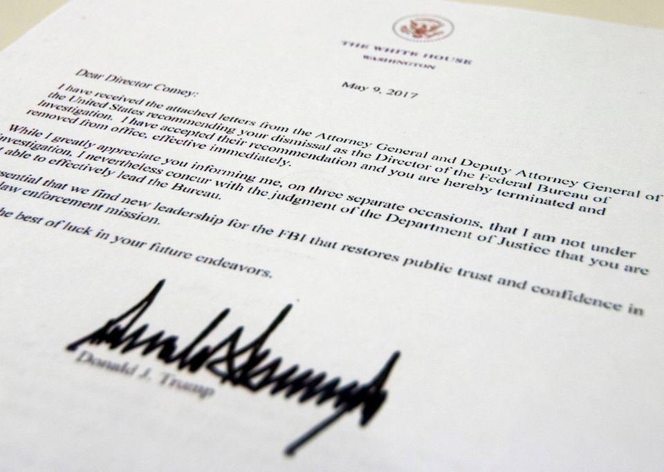 »Jeg har modtaget de vedlagte breve fra justitsministeren og vicejustitsministeren i USA, der anbefaler din afskedigelse som direktør for FBI. Jeg har accepteret deres anbefaling, og du opsiges hermed og fjernes fra kontoret med virkning straks.