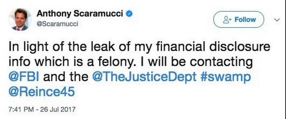 »I tilfælde af at der skulle være tvivl om dette tweet (fra Scaramucci, red.), kan jeg bekræfte at Scaramucci vil have FBI til at efterforske Reince for lækket.«