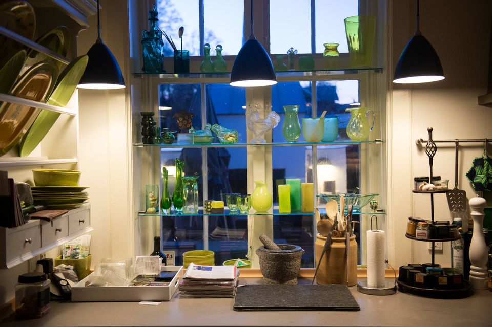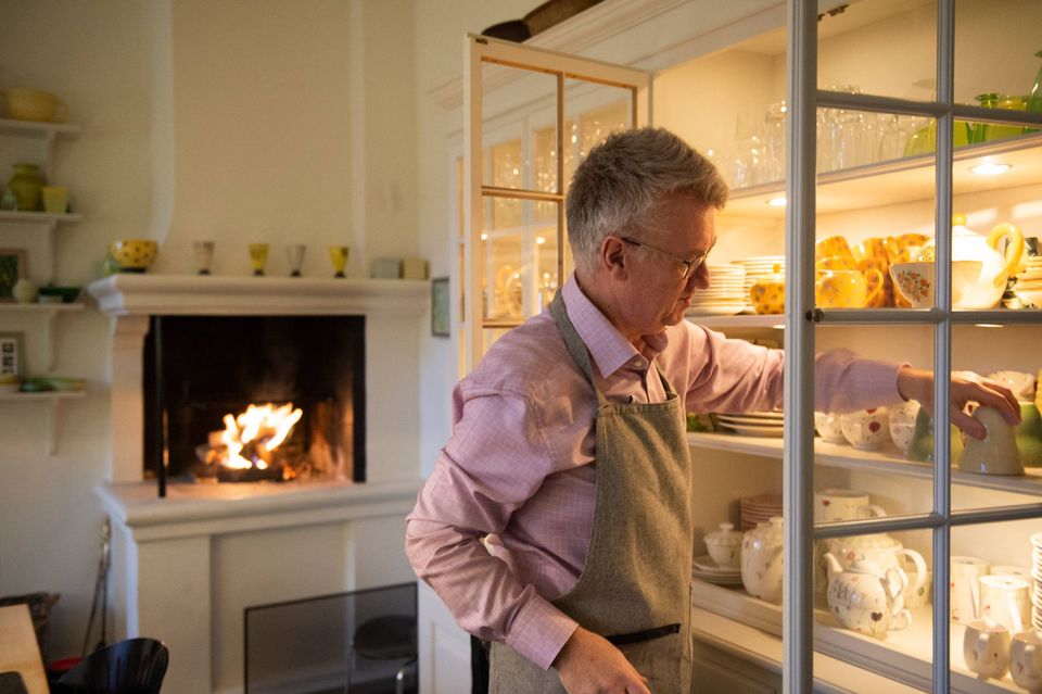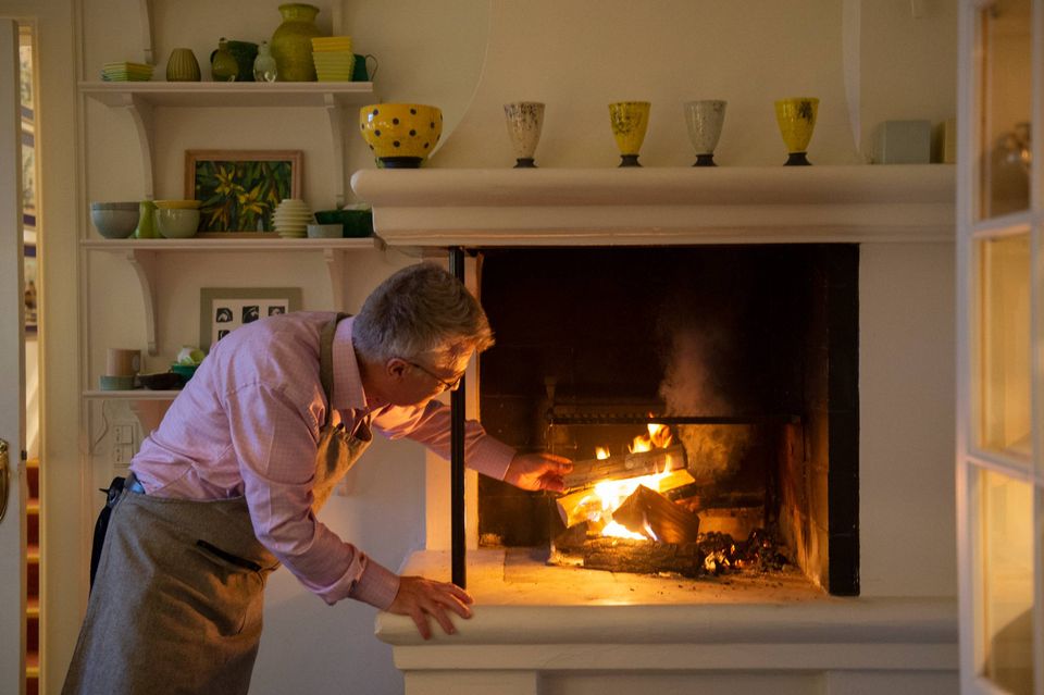 Her i køkkenet har han holdt mange middage, skønt han også kunne have rykket gæsterne ind i sin prætentiøse spisestue, hvor der kan sidde 24 gæster. Det er til at forstå, hvorfor gæsterne bliver hængende i køkkenet. Ilden buldrer i pejsen, det store komfur med to ovne og plads til et hav af gryder, potter og pander på kogepladen, og så er der indretningen med især glas- og keramikskåle i alle tænkelige farver, formfuldendt sat sammen.