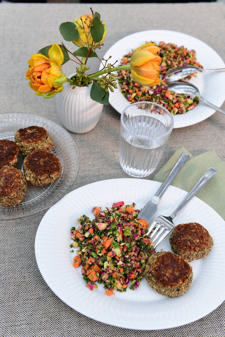 »Grundingrediensen i mine salater er noget proteinrigt. Jeg har hele fryseren fuld af kogte bønner, ris, linser osv. Lige inden vi skal spise, tager jeg en pose op, hælder kogende vand på og bruger dem i salaten. Ris, bønner, linser og quinoa mister intet af at blive frosset. Men grøntsager foretrækker jeg friske.«