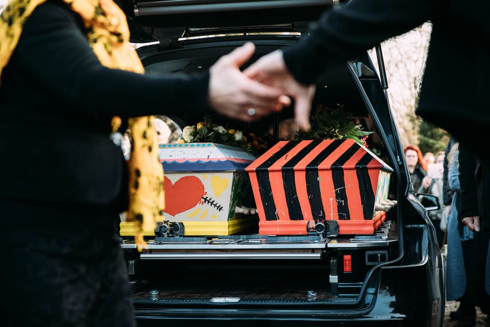 Familien sendte parret, som i årtier har været en stor og aktiv del af musik- og teatermiljøet i Aarhus og ikke mindst Århus Friskole i Stavtrup, af sted med musik, poesi og sang. Børn, børnebørn, familie og venner opførte først en ceremoni fra den cubanske religion santería. Ceremonien hyldede guderne Oshun og Elegua, og derfor var de to kister også malet i gudernes farver. Ivalo Falks kiste i hvidt og gult. Leif Falks kiste i sort og rødt.