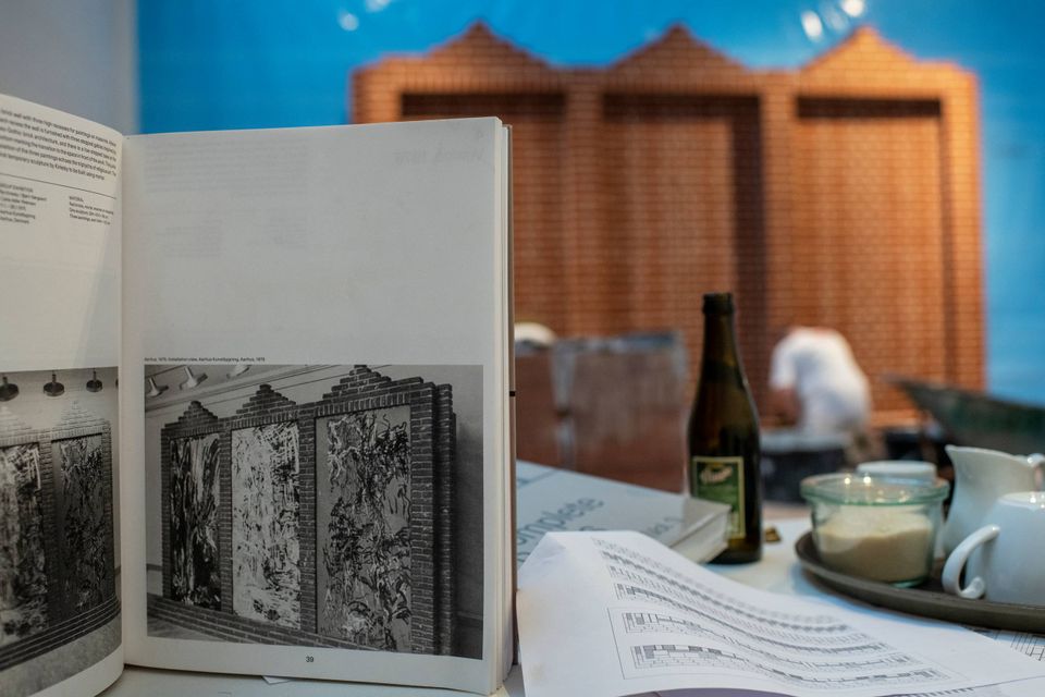 I de kommende dage bliver de tre store af den afdøde kunstners værker, som hører til muren, monteret. Muren er delt op tre rum, som var de murede rammer. Det var sådan, at Per Kirkeby tegnede værket, der senest blev vist frem til en udstilling i Aarhus i 1975.