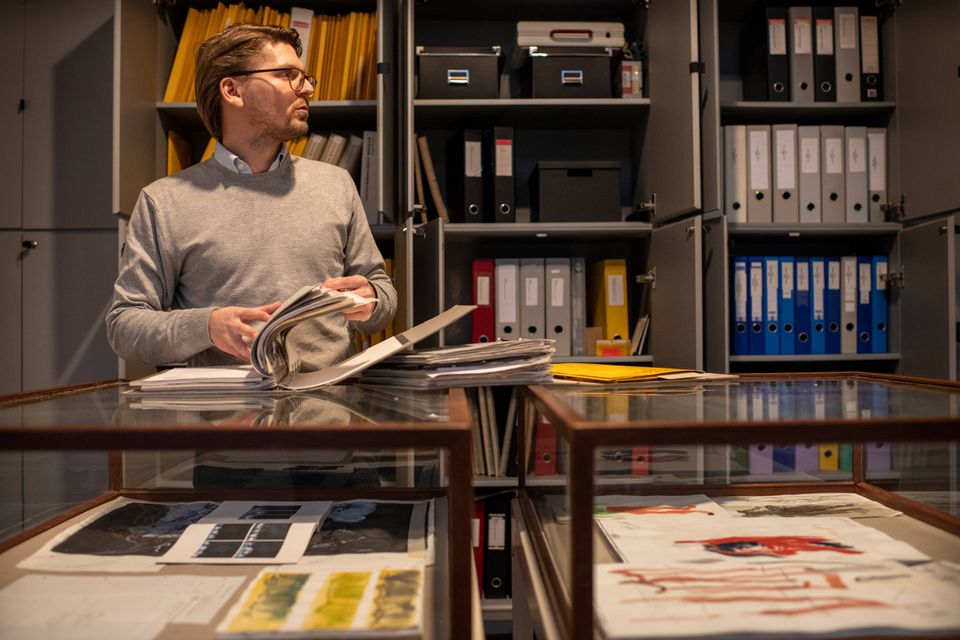 Museumsinspektør Lucas Haberkorn viser det omfattende arkiv om Per Kirkeby (1938-2018), som Museum Jorn har. Det fylder tre rum, som har glasvægge, så publikum kan se det. Flere forskere kommer på museet for at fordybe sig i det unikke materiale. Foto: Joachim Ladefoged