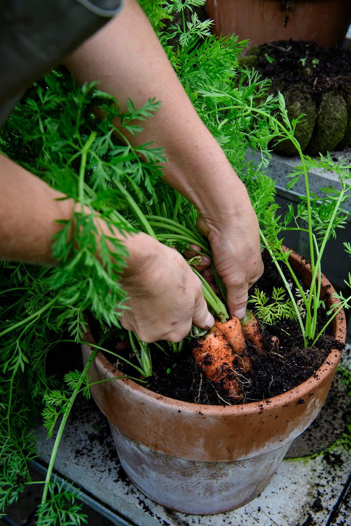 »Man skal planlægge det, for krukken er jo tom, når man har taget gulerødderne op. Man kan f.eks. starte med spinat eller salat, og derefter kan man sagtens plante gulerødder i samme jord. Andre gange er man nødt til at skifte jorden,« siger han, der ellers aldrig har været vild med at dyrke i krukker.