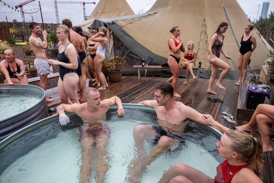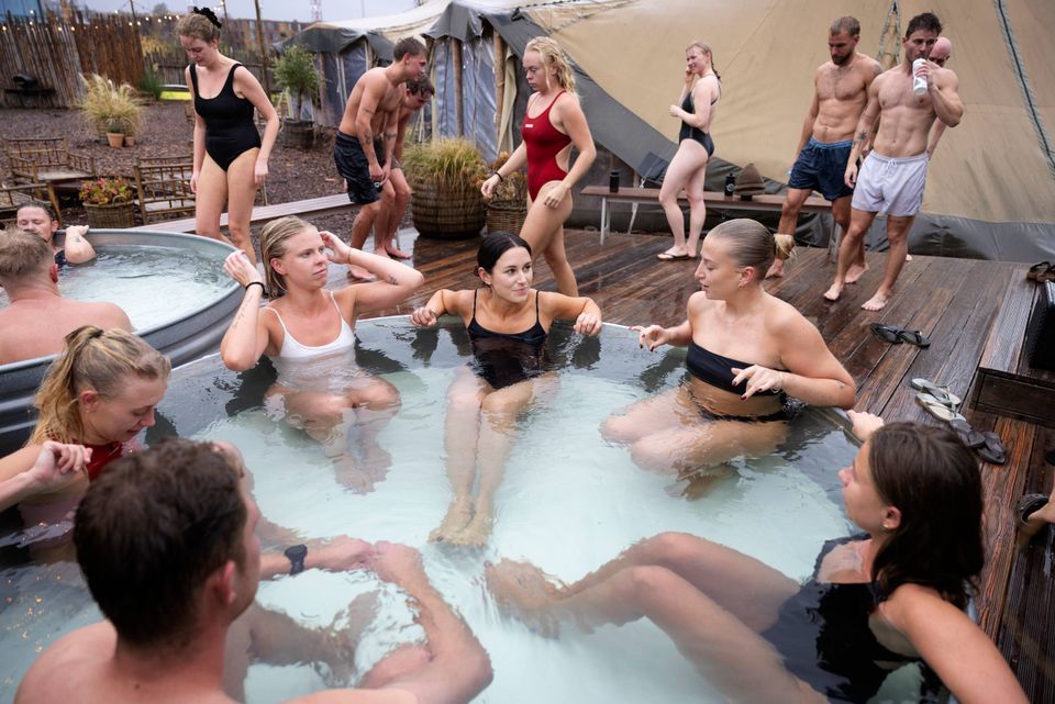 På terrassen damper kroppene i regnen. Folk gisper under de kolde brusere, inden de sænker sig i metalbaljerne. Et gisp, et chok, en latter.