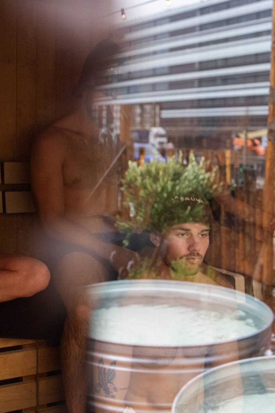 Folk lukker øjnene. Nogle smiler. Andre kæmper for ikke at trække vejret for hurtigt. Det brænder i næseborene. Men ingen forlader saunaen i dagens gus.