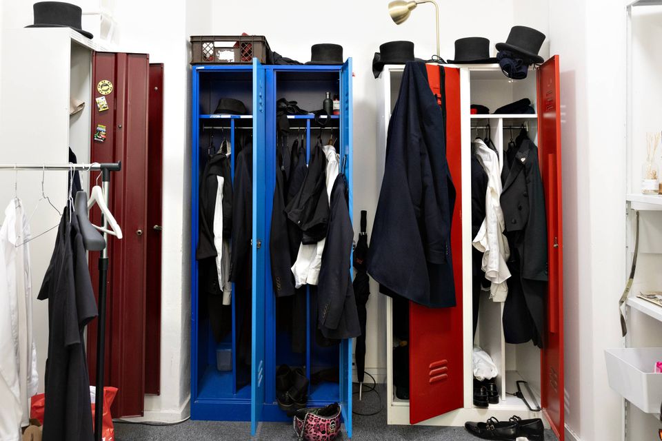 I et lille lokale ligger tophatte oven på metalskabe. Uniformer er kastet over lågerne. Laksko med rødt inderfor står side om side med hverdagssko.