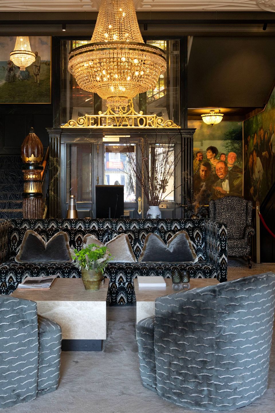 Lobbyen er storslået. Hvidt stengulv folder sig ud under fødderne. En stor pejs langs væggen, hvor en lille gasflamme blinker i genskinnet fra en forgyldt bagagevogn. Over os hænger to lysekroner. Midt i rummet står et gammelt glas- og træbur af en elevator med ordet ”ELEVATOR” i guld over døren.
