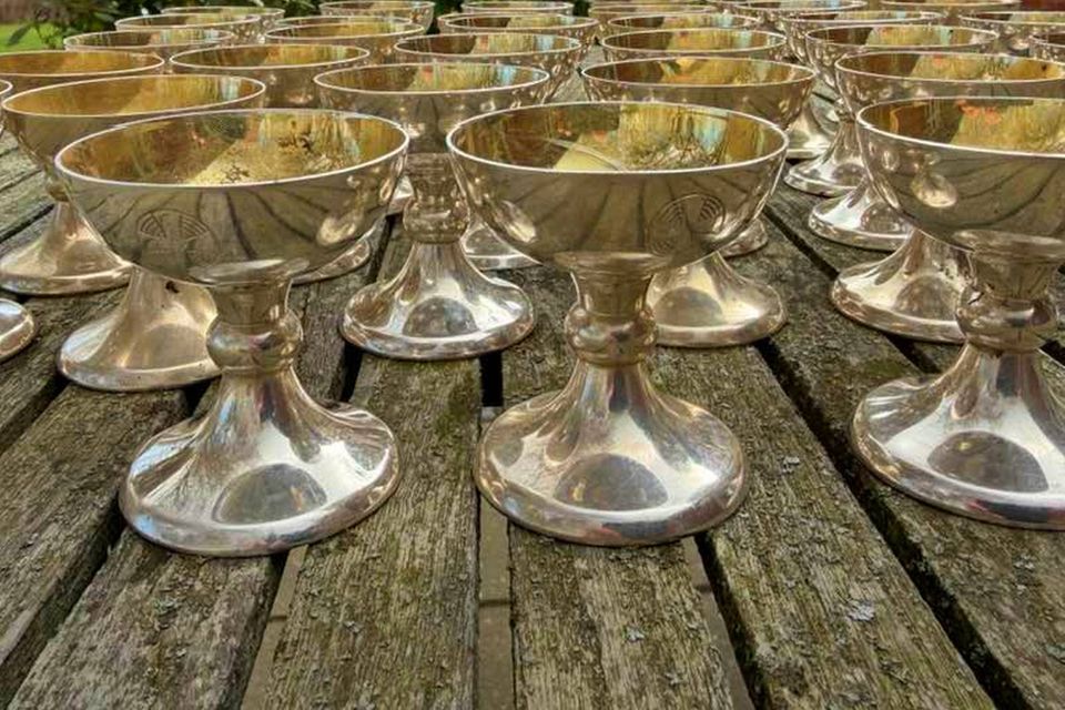 To tunge lysestager, en messingdåbskande og 43 sølvkalke.