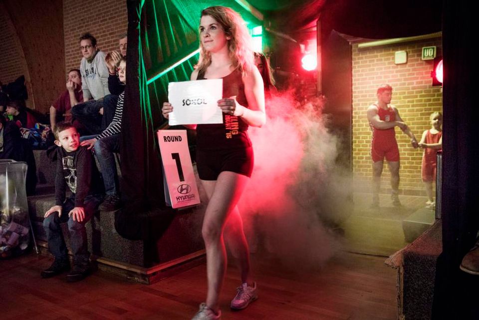 En ældre svensker, der kunne stille op i 120-kilosklassen, hvis han var bryder, hopper op på medaljeskamlen, der står bag dommerbordet. Han klapper af sig selv, og man kan godt se, at der ikke kun bliver serveret danskvand i baren. Så løber han ind på madrassen og svinger vommen til den dunkende rapmusik, inden han lusker over og high fiver de fem dommere ved dommerbordet.