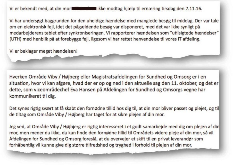 Han skriver ligeledes, at afdelingen foreslår, at »du overvejer et skift til en privat leverandør, som forhåbentlig kan give dig større tilfredshed og tryghed i forhold til plejen af din mor«.