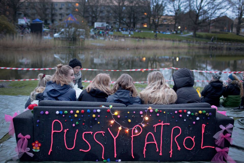 JP Aarhus har fanget syv piger, der har placeret en sofa helt nede ved bredden. ”Pussypatrol” lyser oppe i neonrød fra sofaens ryg, så ingen fra rækkerne bagtil kan være i tvivl om, hvem der sidder på første parket. Pigerne drikker lyserøde Mokai, og humøret er højt.