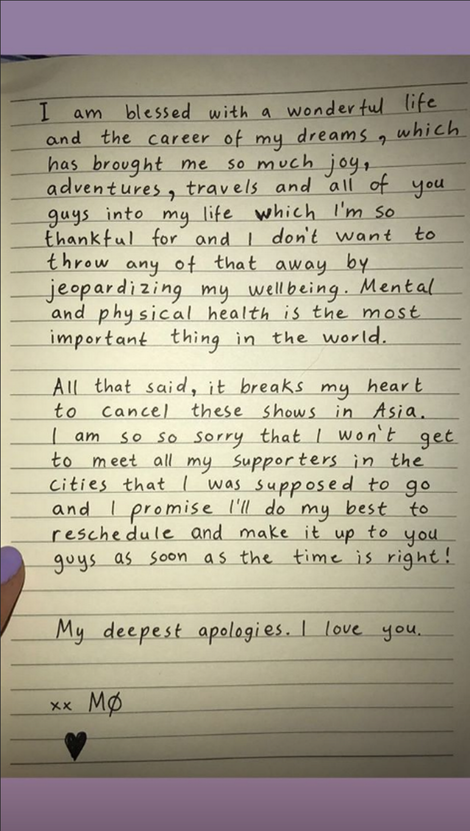 På hendes Instagram har hun lagt et billede op af et håndskrevet brev, hvori hun fortæller, at hun har aflyst den asiatiske del af sin turné af hensyn til sit helbred. Hun skulle ellers efter planen have spillet koncert i Beijing i Kina på tirsdag.