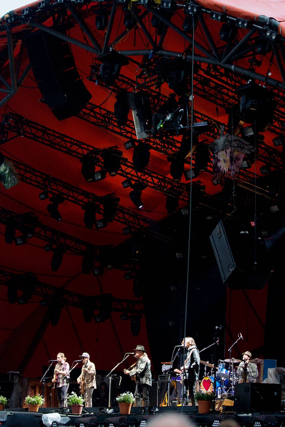 Det virkede, og se så, regnen holdt faktisk op denne fredag aften. Bare fordi han ankom. Og jeg tillægger ikke Neil Young gudelige evner, heller ikke selv om han vil frelse planeten; det er ikke sikkert, han kan det, men at han kan lægge Orange Scene for sine fødder og være hovednavnet sådan en fredag aften i 2016, næsten 50 år efter Woodstock, det er ganske imponerende. Eller måske snarere gribende, for sådan var koncerten.