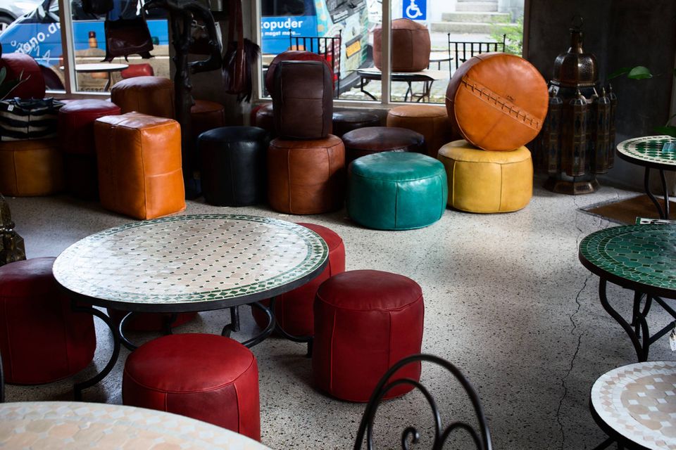 Butikkens stil er rå og enkel med rustikke, pudsede, grå vægge, et gammelt, elegant hvidt glasloft og det oprindelige terrazzogulv med slidbaner fra de over 100 år, her var købmand. Duften af gedeskind rammer næseborene. Marokkopuder, runde og firkantede i 12 forskellige størrelser, i varme orange, røde, sorte, sand og alskens brune nuancer spiller op til de kunstneriske mosaikker på smedejernsborde i alle størrelser. Her er eget design i puder, hynder, borde og jernstole krydret med andet kunsthåndværk og et udvalg af forskellige kunstnere på væggen.
