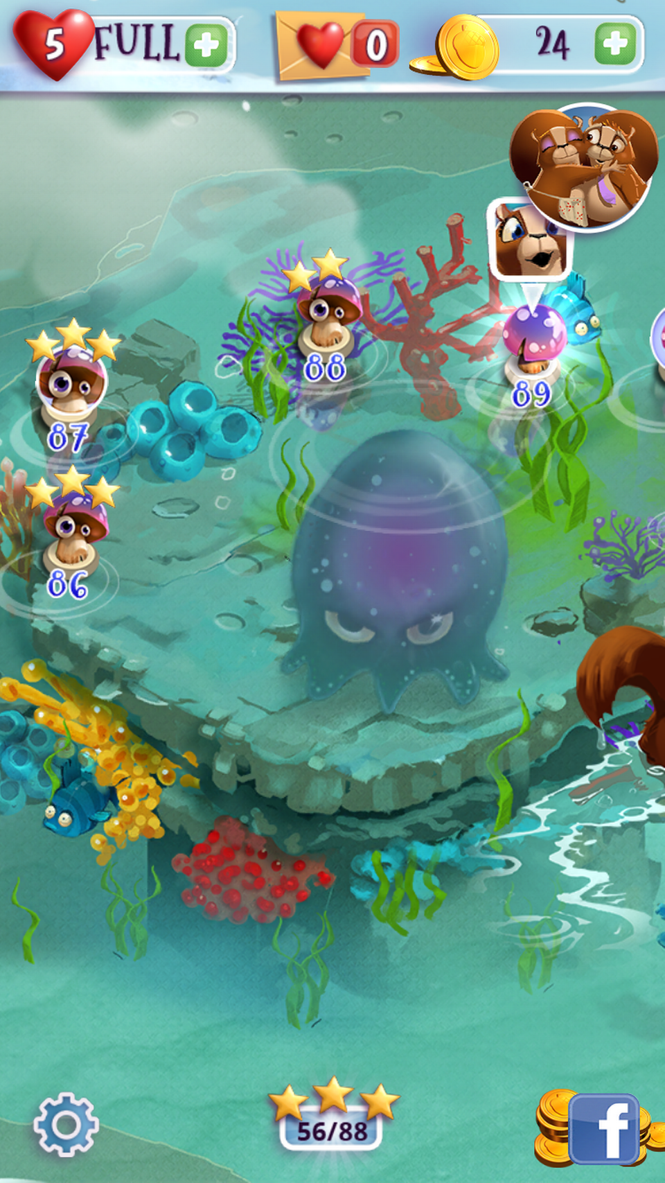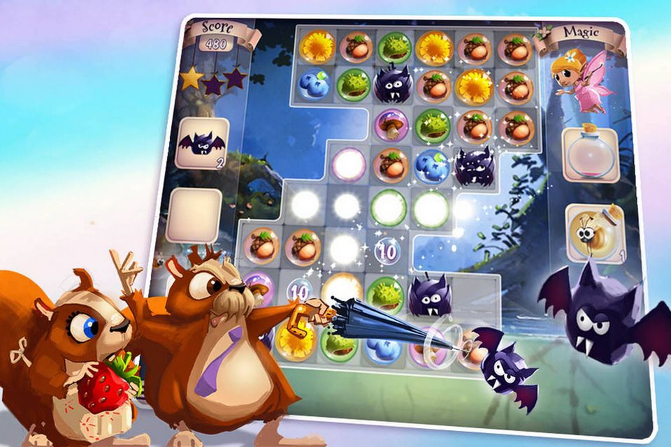 Spillet, som foregår i en pastelfarvet naturverden med Hr. og Fru Egern som hovedpersoner, er klassisk match-3-swiping (få tre eller flere ens figurer på række, i dette tilfælde et væld af forskellige svampe, bær og nødder) kombineret med bubble shooting - en genre, jeg ikke selv kendte det store til i forvejen, men den er gigantisk på de mobile platforme og handler, som navnet antyder, om at ramme de rigtige bobler i stadigt mere indviklede netværk.