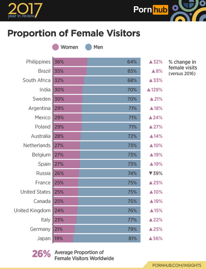 Det amerikanske sexsite Pornhub oplyser således, at dets topsøgning i 2017 var ”Porn for Woman” (porno for kvinder). Stigningen i denne søgning i forhold til året før var på 359 pct., lyder det, fra sitet, der sidste år havde 28,5 mia. visninger.