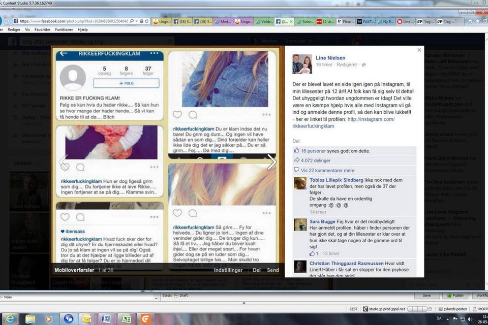 Sådan står der på en hadefuld Instagram-profil ”rikkeerfuckingklam”, som er oprettet af en anonym person. Budskabet er møntet på en 12-årig pige fra Randers, som har fået massiv opbakning på Facebook, efter at sagen er kommet frem, og hendes storesøster har bedt om hjælp til at stoppe mobningen.