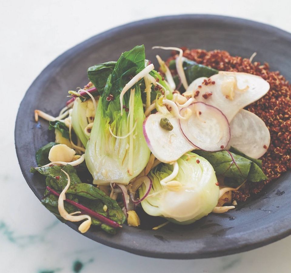 6. Top med pak choi, bønnespirer, rødbedeskud, majroe og hakkede macadamianødder.