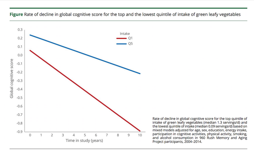 Deltagerne fik undervejs testet deres kognitive færdigheder (arbejdshukommelse, opfattelsesevne, logisk tænkning m.m.) på 19 forskellige måder, og det er gennemsnittet af disse tests (Global cognitive score), der afgør kurvernes hældning. Forskellen mellem dem, der spiste flest og færrest bladgrøntsager, kan omregnes til ca. 11 års forskel på hjernens funktionelle alder.