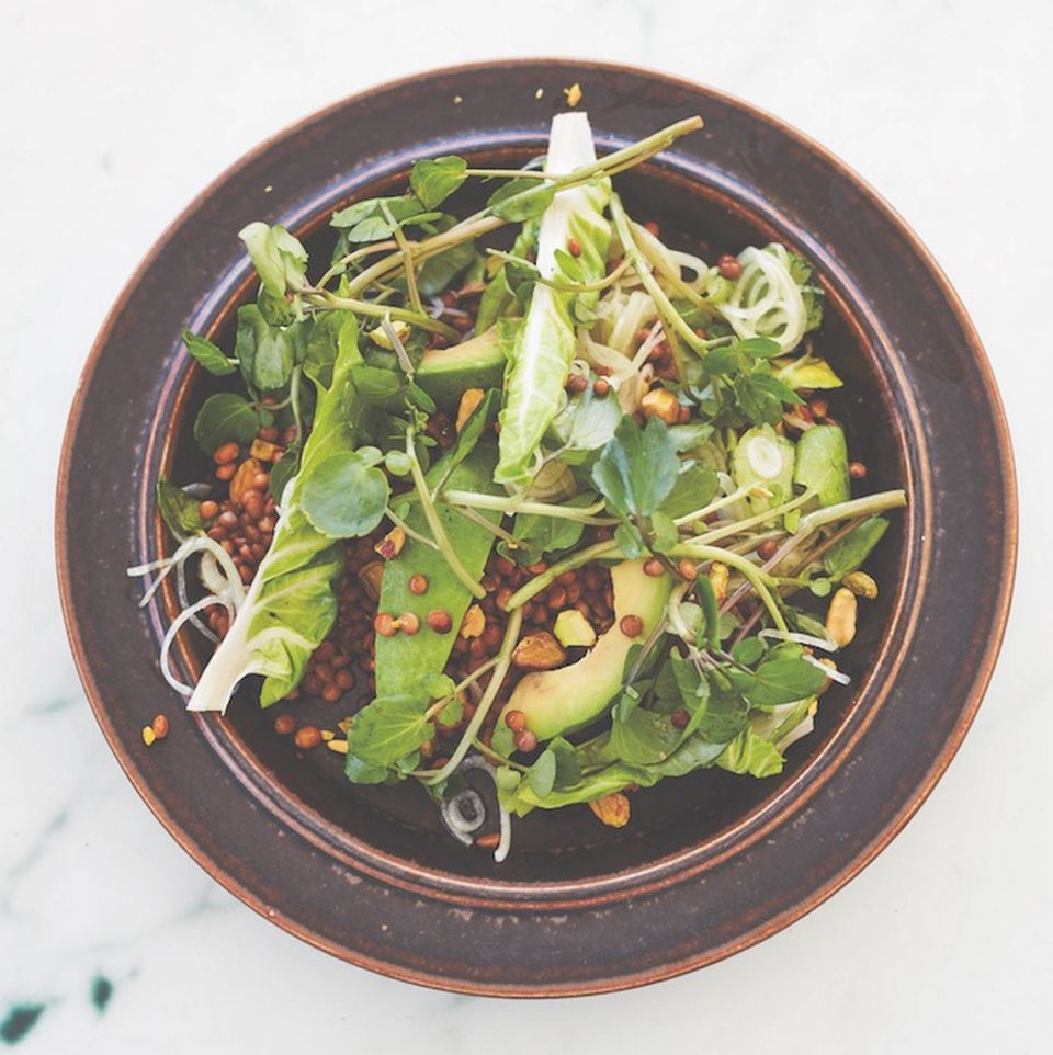 6. Læg de blandede grøntsager på et fad og top med avocado, pistacienødder og brøndkarse.