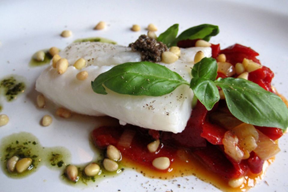 Anmelderen valgte fra kortet en vitello tonnato (60 kr.) som forret og en unghane i hvidvin (155 kr.) som hovedret.