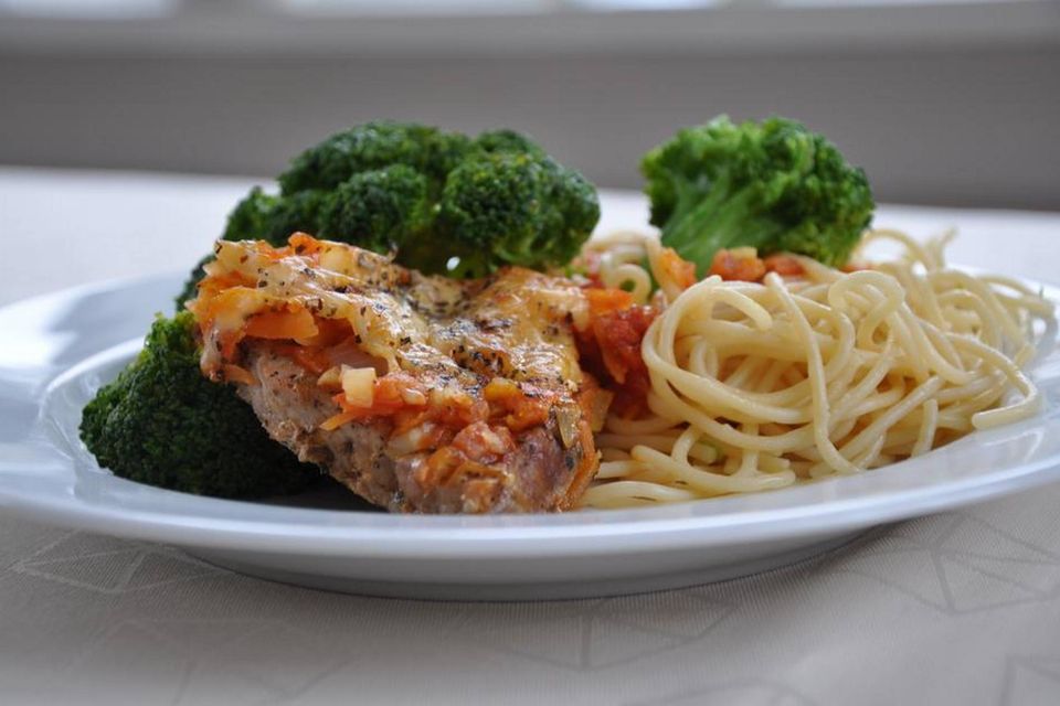 - Gulerødderne rives, pølsen og løgene skæres i fine tern. Steg løg og pølse i olie, tilsæt gulerødder og senere hakkede tomater. Krydr godt med chili, basilikum, salt og peber. Gulerodsblandingen hældes over koteletterne. Drys reven ost øverst og sæt fadene i ovnen igen. Når osten har fået farve, er retten færdig.