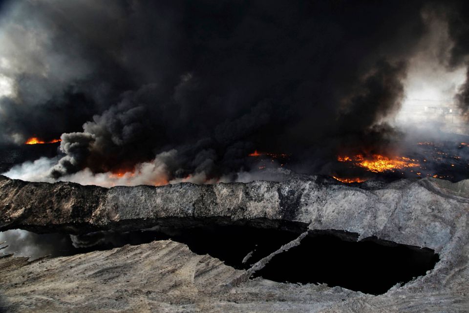 En af Islamisk Stats taktikker for at sinke den irakiske fremrykning er at sætte ild til oliebrønde i det olierige område omkring Mosul. CNN beskriver i en reportage, hvordan denne taktik ikke blot slører kampflyenes overblik over slagmarken, men også går hårdt ud over civilbefolkningen i området, der visse steder må leve i et massivt slør af tyk, olieholdig, giftig røg i flere måneder ad gangen. »Børn med sorte hænder og sodplettede ansigter leger under de giftige skyer. Den tidlige eftermiddagssol er så sløret af røgen, at dag virker som et endeløst tusmørke,« indleder CNN's korrespondent sin reportage, der giver et skræmmende indblik i konsekvenserne af denne moderne udgave af "den brændte jords taktik".