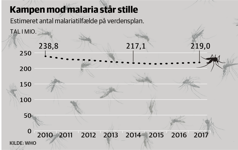 Sidste år menes 219 millioner mennesker at være blevet smittet med malaria, som udløses af encellede parasitter, der overføres af malariamyggen. Der findes forskellige typer malaria, hvoraf nogle kan være livstruende. WHO skønner, at 435.000 mennesker døde som følge af infektionen i 2017, 80 pct. heraf i blot 17 lande.