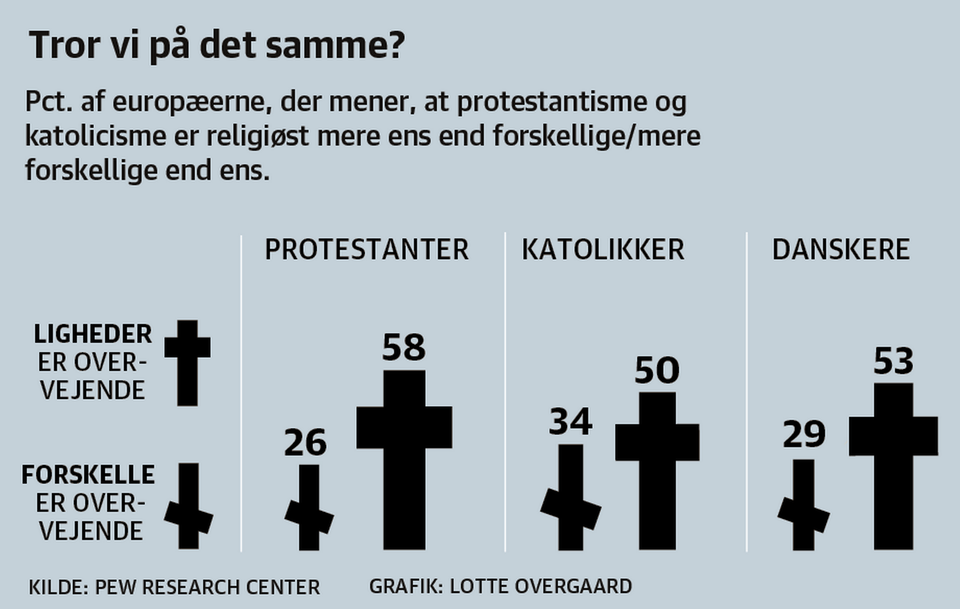 500 år efter, at Martin Luther udgav sine 95 teser i Wittenberg, mener vesteuropæerne ikke længere, at der er de store religiøse forskelle mellem protestanter og katolikker. Det viser en undersøgelse foretaget af Pew Research Center.