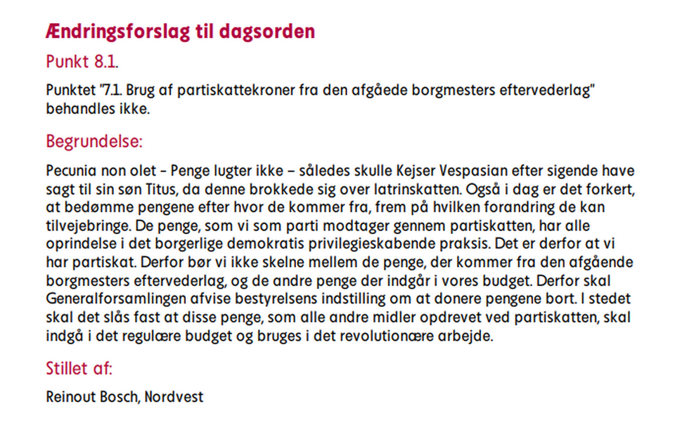 Forslaget om at beholde Morten Kabells partiskat var stillet af nuværende bestyrelsesmedlem Reinout Bosch fra Nordvest. I begrundelsen for forslaget citerede han bl.a. den romerske kejser Vespasian (år 69-79), der sagde til sin søn Titus at »penge lugter ikke« − dermed heller ikke penge fra en politikers dobbeltløn.