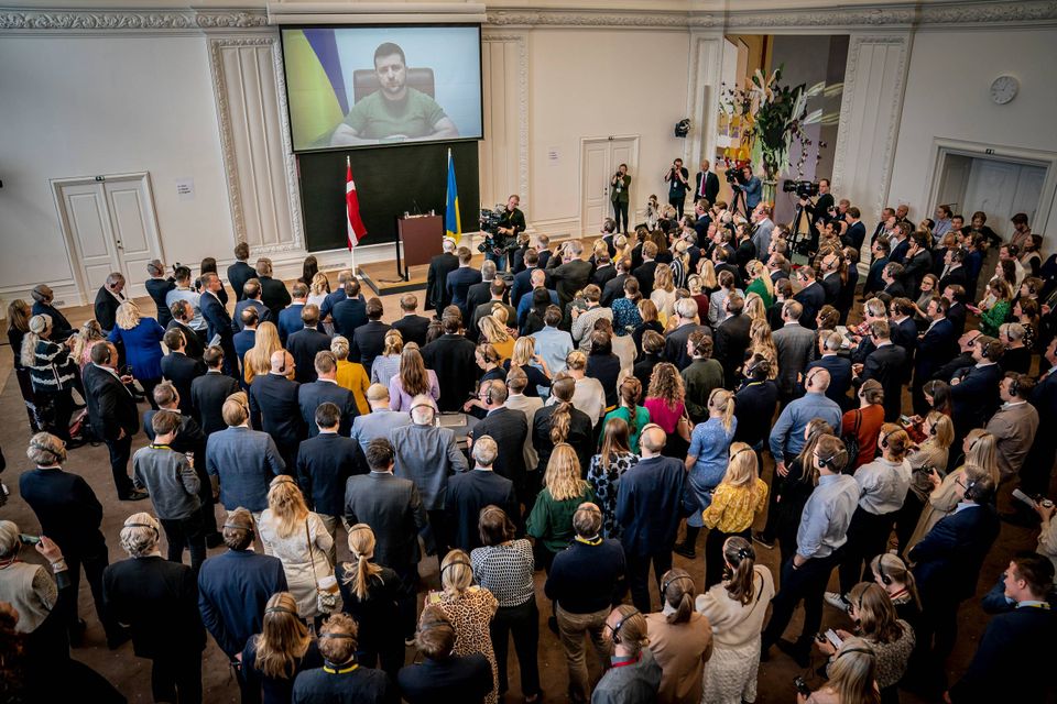 Det var en dag, hvor historiens schwung skulle blafre i det ukrainske flag, der vajede fra Folketingets flagstang. Men det begyndte alligevel sådan, som mange danskere efterhånden har lært, at videomøder ofte begynder. Der var tekniske problemer.