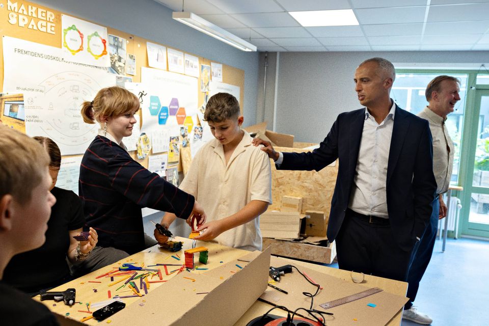 Kortvarigt kigger klassens seks elever op fra papmodeller, limpistol og farvestrålende ispinde for at nikke pænt til børne- og undervisningsminister Mattias Tesfaye (S) og Dansk Erhvervs direktør, Brian Mikkelsen.