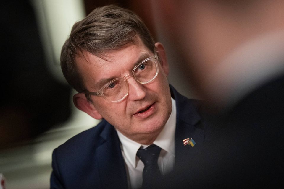 Troels Lund Poulsen (V) trisser ned ad trappen i forhallen i Forsvarsministeriet.