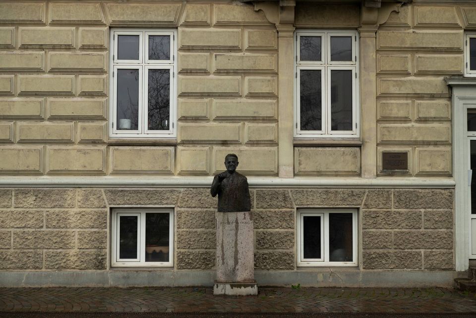 Bronzebusten af den socialdemokratiske statsminister og formand Jens Otto Krag glaner ud over den regnvåde plads, han har lagt navn til her midt i Randers. En tidligere socialdemokratisk højborg og barndomsby til det måske største koryfæ i partiets historie.